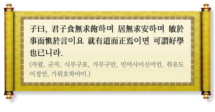 子曰(자왈) 선생님께서 말씀하셨다. “君子食無求飽(군자식무구포) 군자가 먹는 데 배부름을 구하지 아니하며, 居無求安(거무구안) 거처하는 데 편안함을 구하지 아니하며, 敏於事而愼於言(민어사이신어언) 일을 하는 데 있어서는 민첩하게 하면서 말을 하는 데는 삼가고, 就有道而正焉(취유도이정언) 도가 있는 사람에게 나아가서 자신을 바르게 한다면 可謂好學也已(가위호학야이) 학문을 좋아한다고 이를 만하다.”