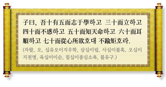 子曰(자왈) 선생님께서 말씀하셨다. “吾十有五而志于學(오십유오이지우학) 나는 열다섯에 학문에 뜻을 두었고, 三十而立(삼십이립) 서른에 섰고, 四十而不惑(사십이불혹) 마흔에는 미혹되지 아니하였고, 五十而知天命(오십이지천명) 쉰에 천명을 알았고, 六十而耳順(육십이이순) 예순에 귀가 따랐고, 七十而從心所欲(칠십이종심소욕) 일흔에는 마음이 하고자 하는 바를 따라도 不踰矩(불유구) 법도를 넘지 않게 되었다.”