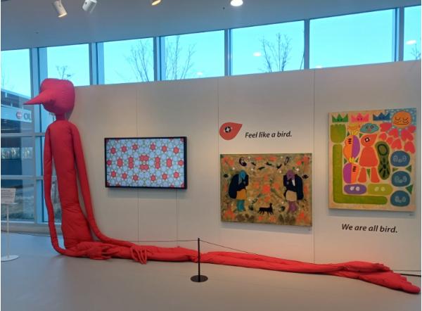 동자동휘 작가는 새를 영감으로 한 따뜻한 색감의 평면 작품과 영상을 통해 배움이 주는 회복과 성장의 메시지를 시민들에게 전달한다.