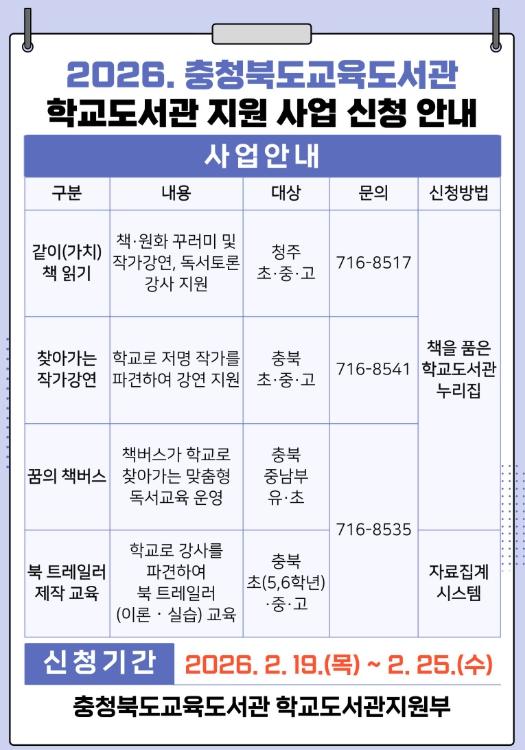[시경신문, 김호진기자] 충청북도교육청 직속기관 교육도서관은 ‘언제나 책봄’ 정책과 연계해 학생 참여 중심의 독서교육을 활성화하고, AI‧영상 시대에 대응하는 도서관의 새로운 역할 강화를 위한 학교도서관 지원 사업을 오는 19일(목)부터 25일(수)까지 접수한다.