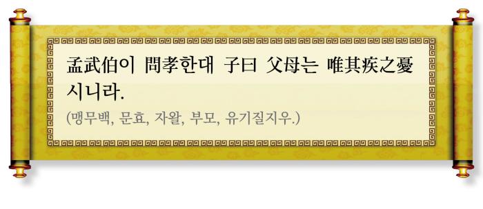 孟武伯問孝(맹무백문효) 맹무백이 효를 물으니 子曰(자왈) 선생님께서 말씀하셨다. “父母唯其疾之憂(부모유기질지우) 부모는 오직 그들의 병을 근심하신다.”