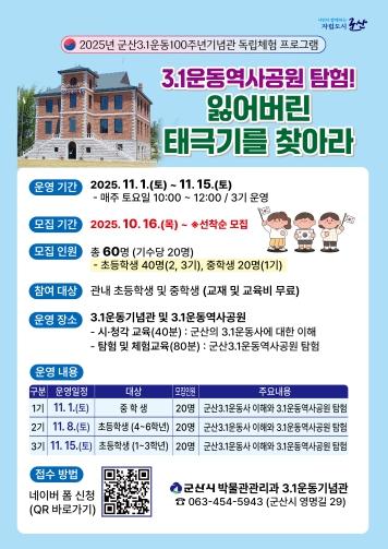 이번 프로그램은 초등학생과 중학생을 대상으로 독립운동 체험행사로 11월 1일부터 15일까지 매주 토요일(3기)까지 진행되며, 특히 10월 말 개관 예정인 군산선교역사관과 연계되어 운영될 예정이다.