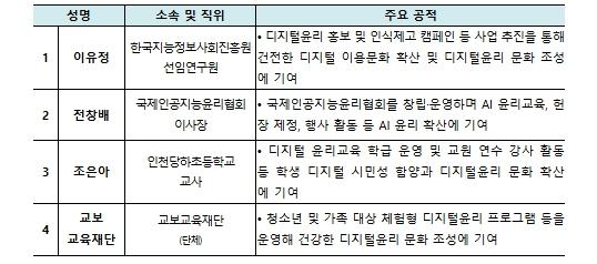 ‘디지털윤리 문화조성 유공’ 표창에는 디지털윤리 교육 및 인식 제고에 기여한 공로로 이유정 한국지능정보원 선임과 전창배 국제인공지능윤리협회 이사장, 조은아 인천당하초등학교 교사, 교보교육재단(단체)이 선정됐다.