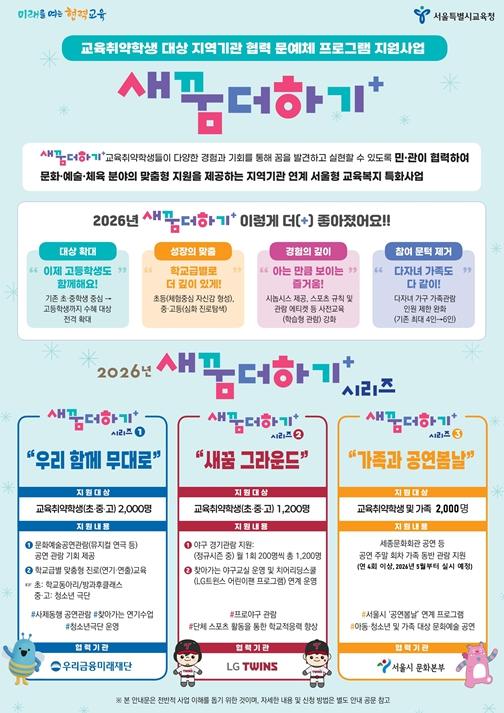 [시경신문, 김호진기자] 서울특별시교육청은 교육취약학생에게 문화·예술·체육 및 진로탐색 기회를 제공하는 민관협력 교육복지 사업 ‘새꿈더하기’를 2026년 더욱 확대 운영한다고 밝혔다.